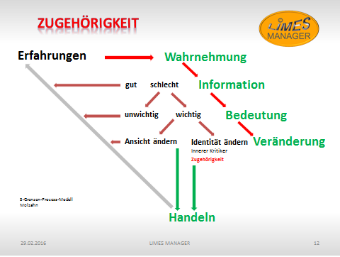 Wir als Coaches arbeiten mit dem 5-Grenzen-Prozessmodell von Molzahn und Schlehuber (Elke Schlehuber und Rainer Molzahn, GABAL Management 2007, Die heiligen Kühe und die Wölfe des Wandels).